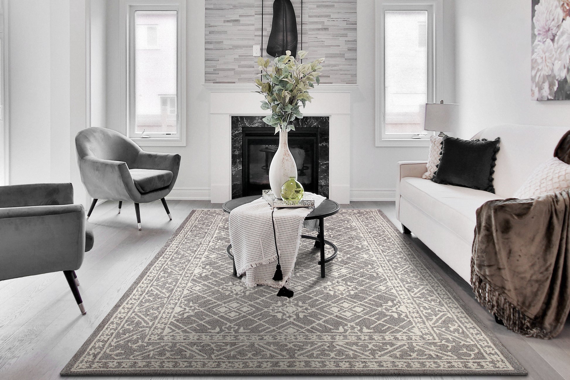 This wool collection, Galleria, is all loop and handmade by expert artisans in India. The designs on these rugs are intricate while also being bold and elegant in their symmetry and use of color. Galleria rugs are not something that one gets tired of looking at, making it a great focal point for any room. Its use of tonal or primary colors makes it not only to accessorize with, but also makes rugs in this collection versatile in that they work both in formal and informal settings.