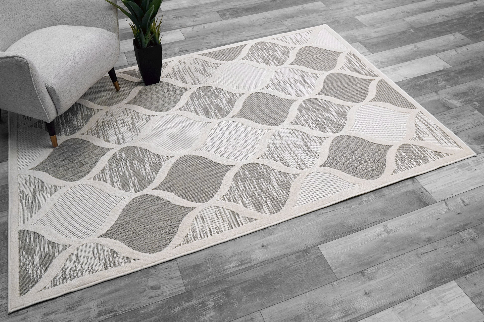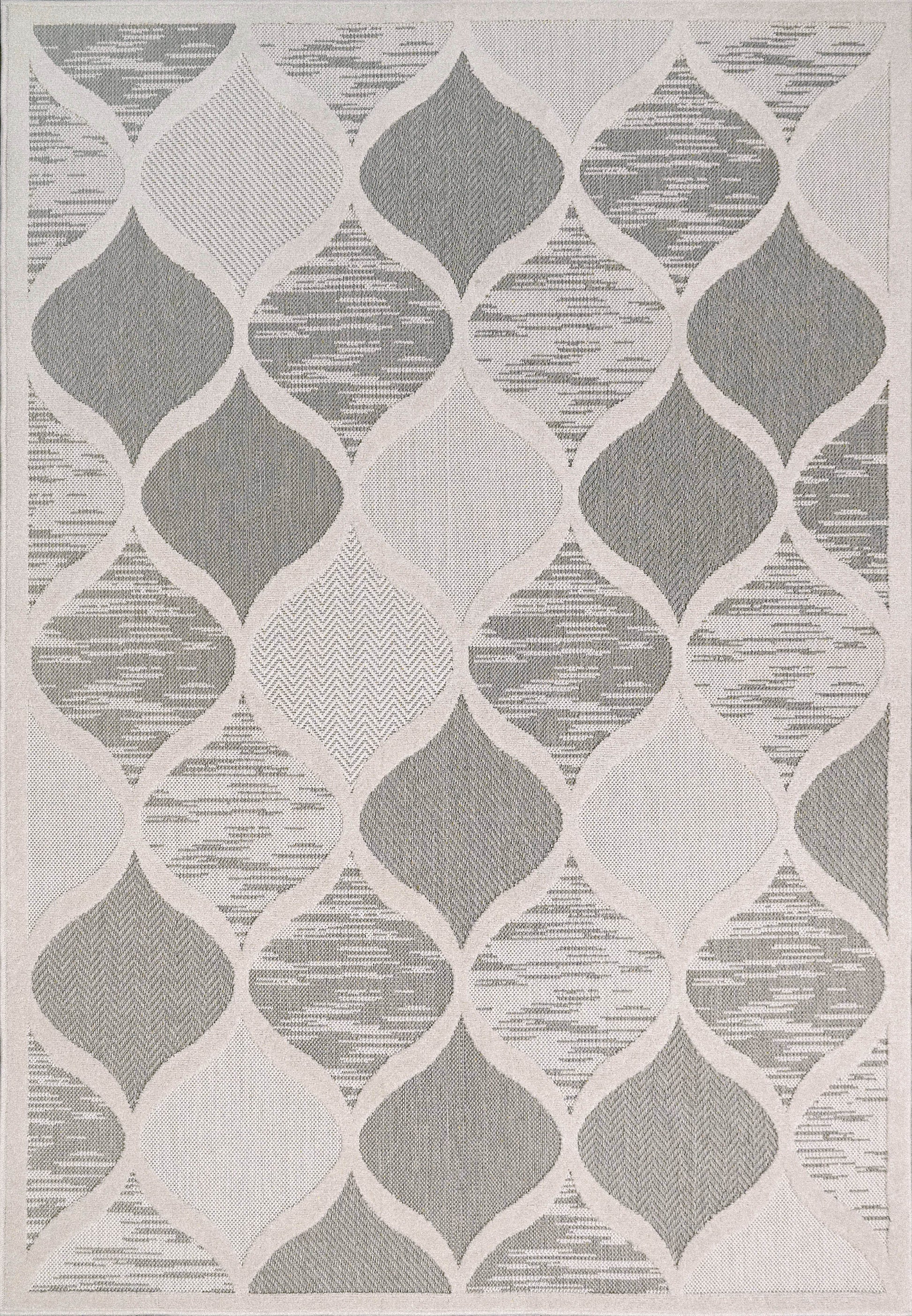 The Tessie collection consists of great rugs for both indoor and outdoor use. Its modern and eye-catching designs, combined with the neutral grey colors allow for the collection to be a great choice for any kind of décor you might have inside or outside your home. Machine-made of polypropylene, rugs in the Tessie collection will be able to withstand the elements it will face as an outdoor rug. The Tessie collection is made in Turkey.